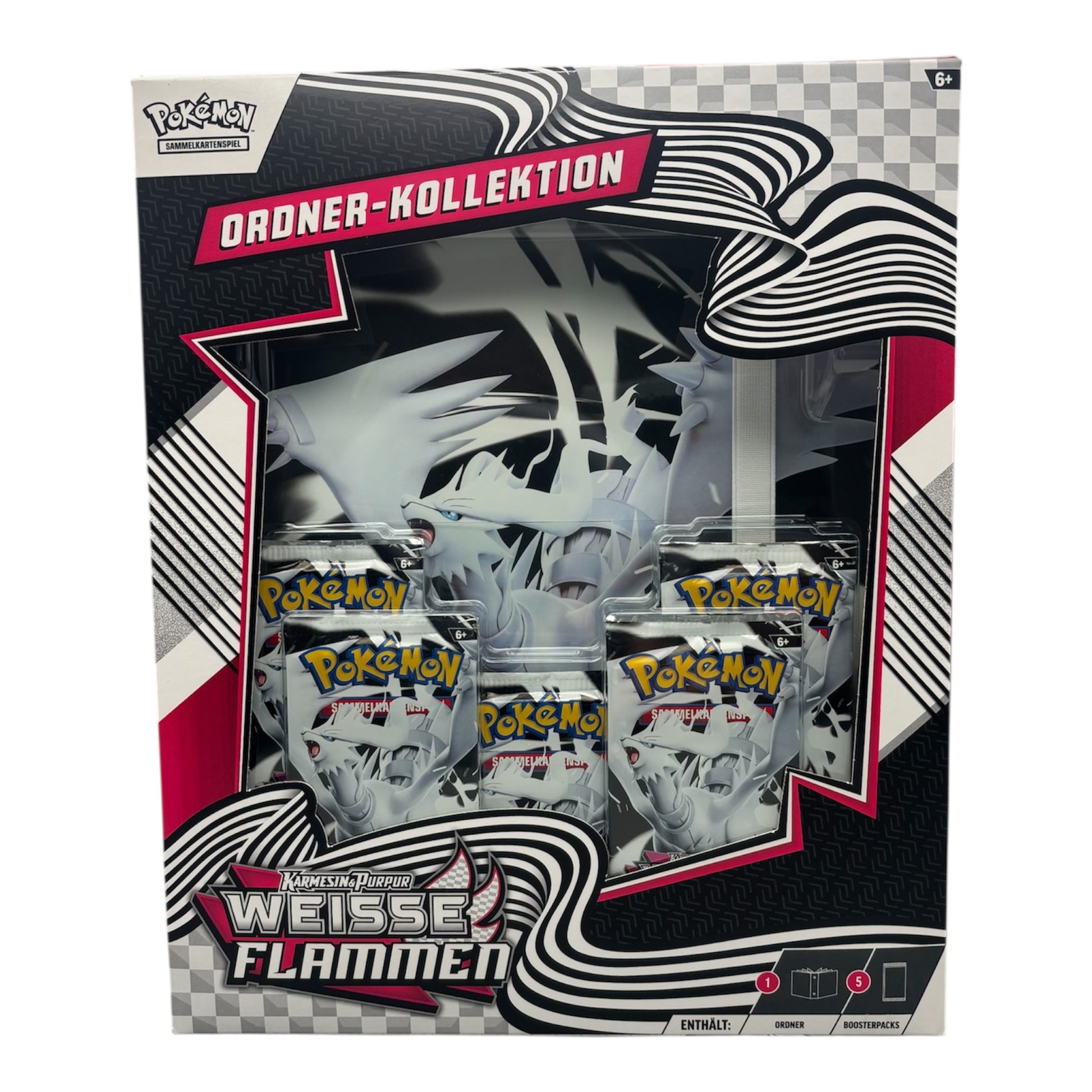 - Inhalt: 5 Boosterpacks der Karmesin & Purpur Erweiterung Weisse Flammen und Ordner
